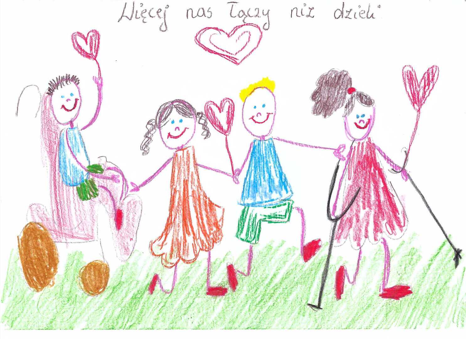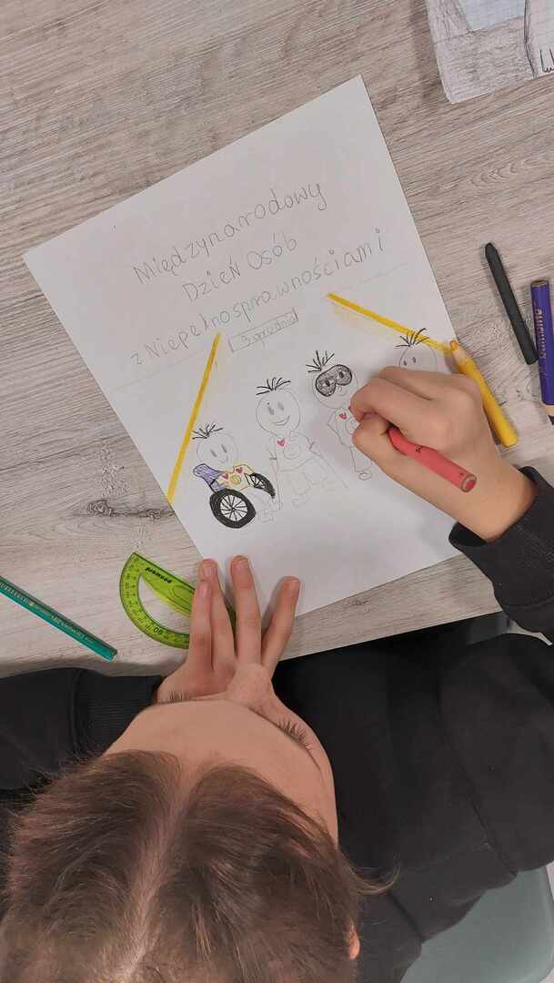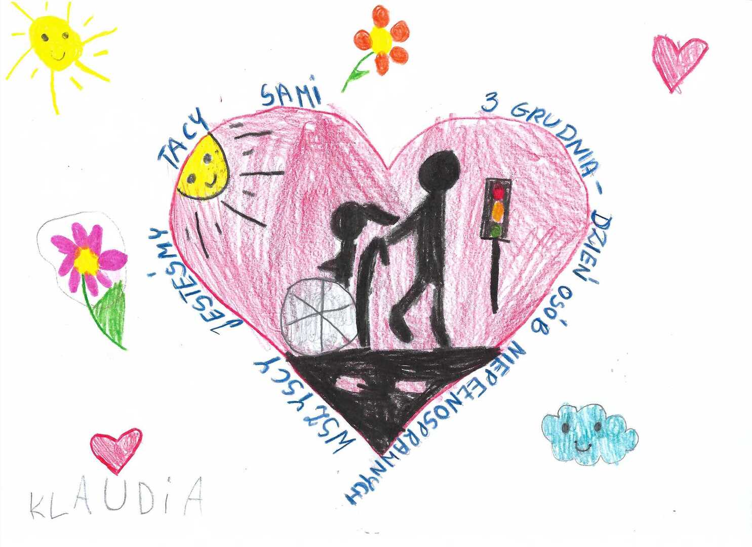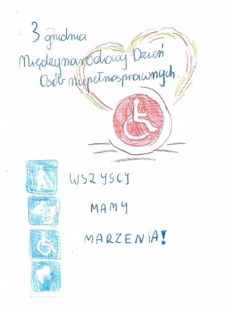 3 grudnia obchodzony jest Międzynarodowy Dzień Osób z Niepełnosprawnościami. Z tej okazji wychowankowie Placówki Wsparcia Dziennego "Promyk" wykonali rysunki, których tematem przewodnim była niepełnosprawność. Celem tych działań było przybliżenie dzieciom problemów osób z niepełnosprawnościami, u których występują ograniczenia w prawidłowym funkcjonowaniu spowodowane obniżeniem sprawności fizycznej lub psychicznej, albo nieprawidłowości w budowie i funkcjonowaniu organizmu.