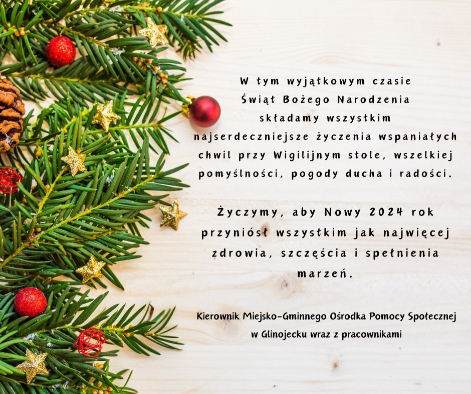 Życzenia świąteczne Opublikowano: 20 grudnia 2023 14:42 Kategoria: Aktualności Wydrukuj Wyświetleń: 75 Zobacz również Program "Opieka wytchnieniowa" dla Jednostek...Bon ciepłowniczy Zbiórka pieniędzy dla rodziny poszkodowanej w...Dzień wolny od pracy Wydawanie żywności - Program Fundusze Europejskie... Asystent osobisty osoby z niepełnosprawnością dla...