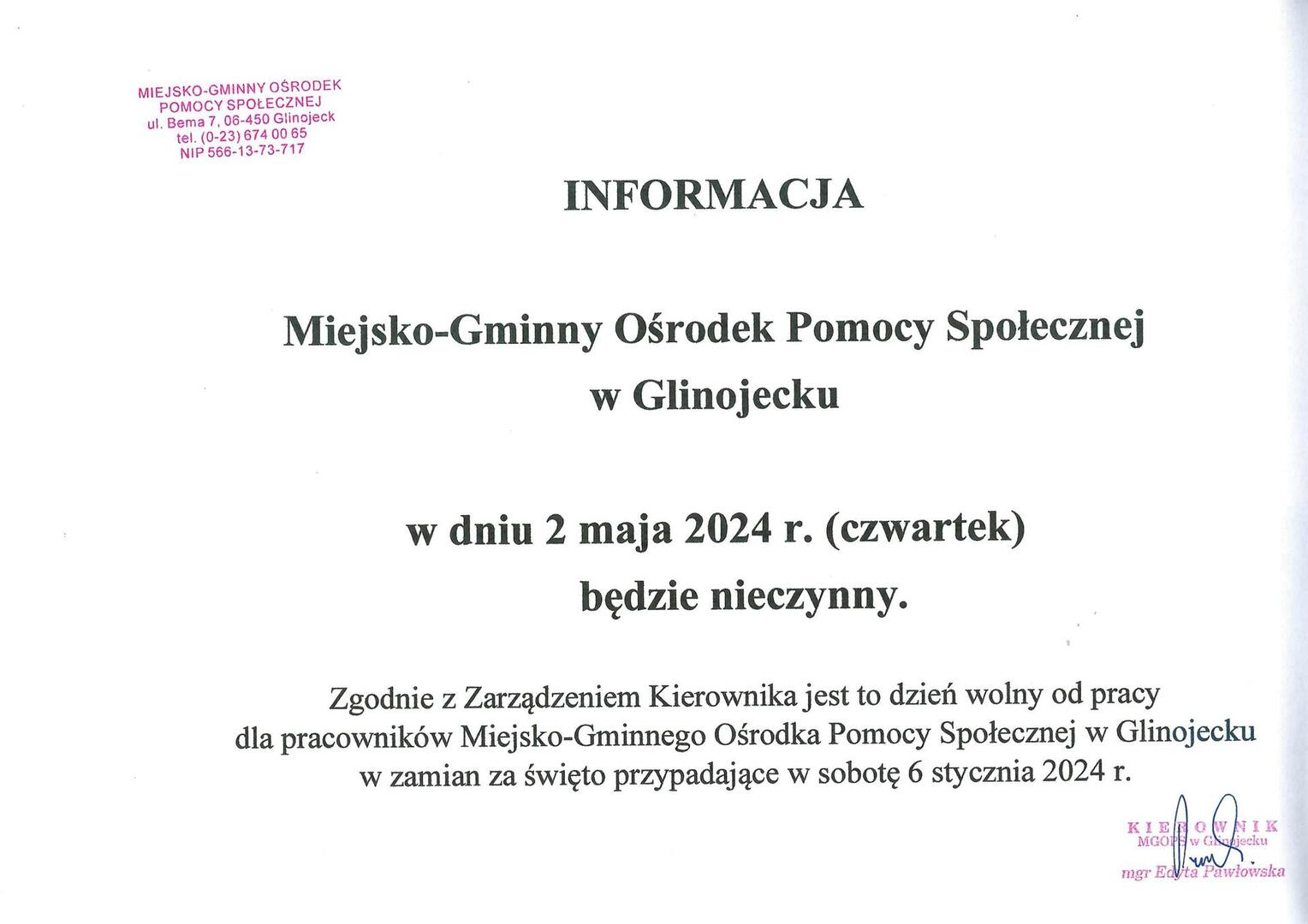 Dzień wolny od pracy Opublikowano: 15 kwietnia 2024 12:50 Kategoria: Aktualności Wydrukuj Wyświetleń: 84 Zobacz również Program "Opieka wytchnieniowa" dla Jednostek...Bon ciepłowniczy Zbiórka pieniędzy dla rodziny poszkodowanej w...Dzień wolny od pracy Wydawanie żywności - Program Fundusze Europejskie... Asystent osobisty osoby z niepełnosprawnością dla...